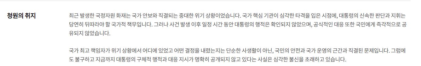 국민은 국가적 위기에서 대통령이 어디에 있었는지, 무엇을 했는지 확인할 권리가 있습니다. 국가 위기관리의 최종 책임자는 대통령이며, 행적 공개는 선택이 아니라 의무입니다. 이를 외면한다면 국민적 불신은 더욱 커질 수밖에 없습니다.